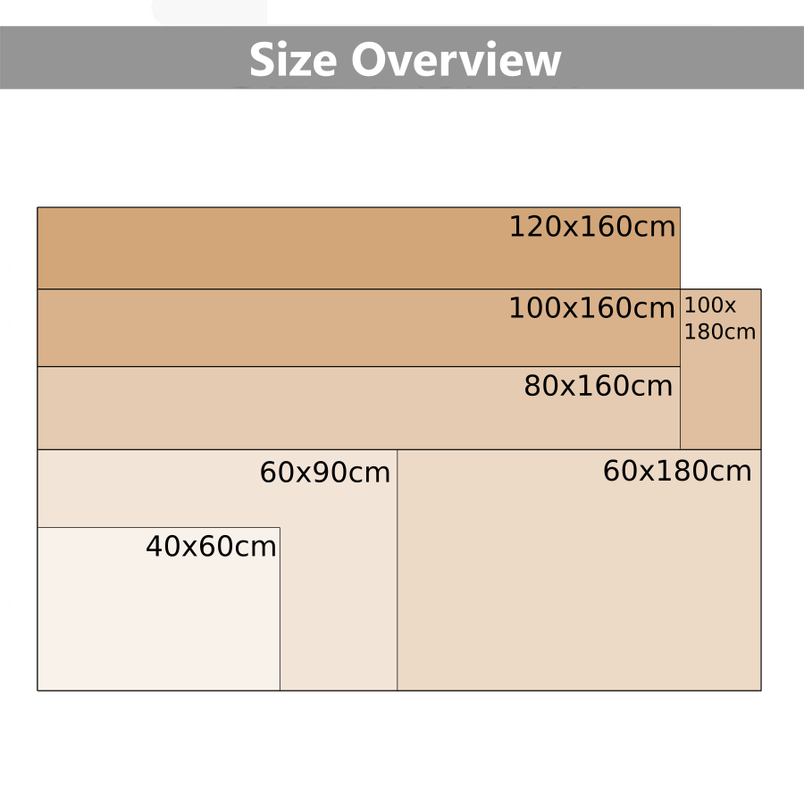40 x 60 cm, 60 x 90 cm, 60 x 180 cm, 80 x 160 cm, 100 x 160 cm, 100 x 180 cm, 120 x 160 cm